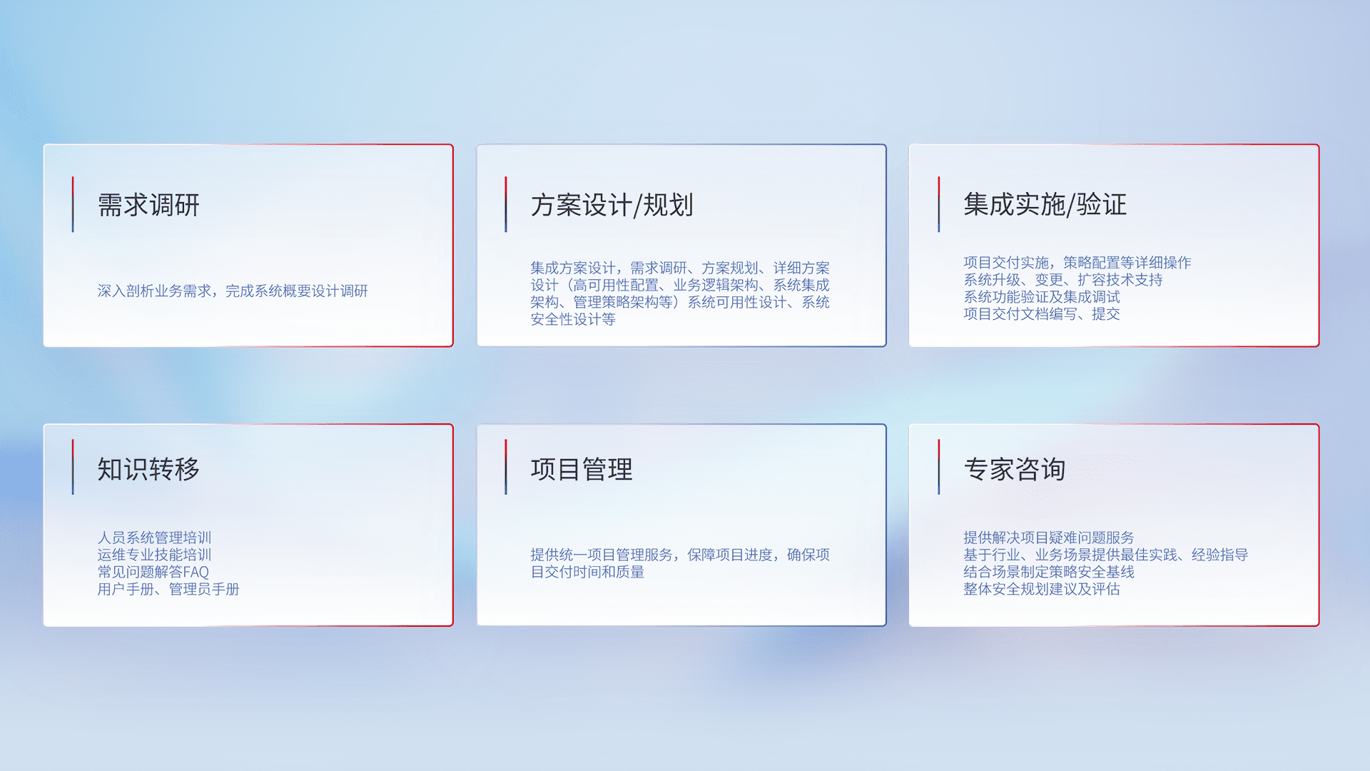 针对客户行业特性,,将宏观的安全战略和需求,,,通过专业的交付服务,,实现项目落地,,,为客户提供标准规范的集成交付服务。。